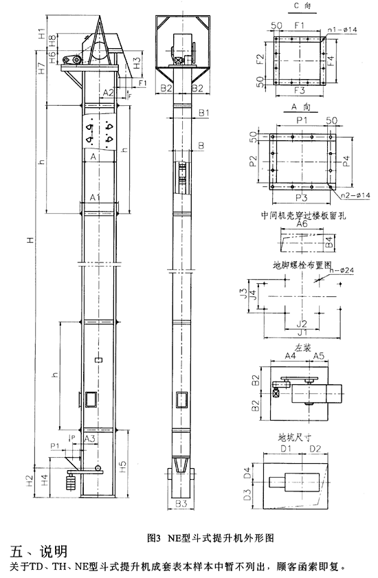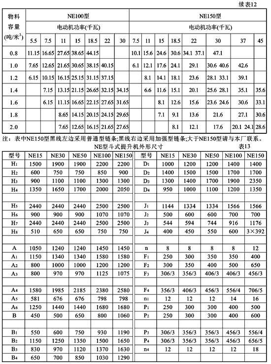 NE型提升機(jī)的組合尺寸本樣本中暫末列出,每臺提升機(jī)一股只配套一節(jié)帶有檢視門的中間機(jī)殼。若用戶要求增加帶檢視門中間機(jī)殼數(shù)量或改變檢視門的開孔位置,應(yīng)在訂貨時注明。