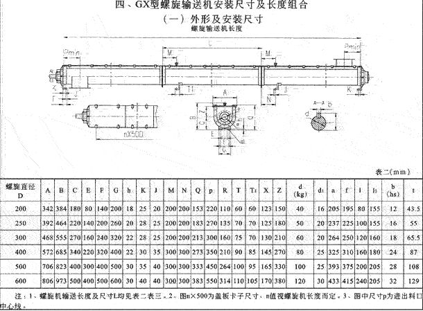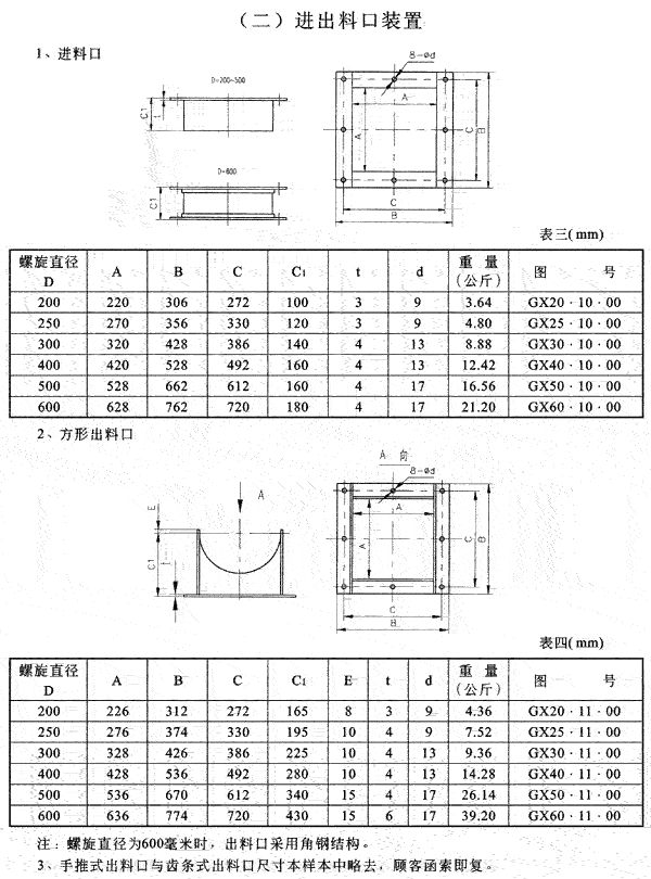GX型螺旋機的出料口有方形出料口、手推式出料口和齒條式出樹口三種。后兩種出料口拉板的開閉方向,隨安裝不同而分右裝、左裝兩種;