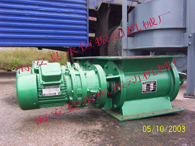 GY型剛性葉輪式給料機是一種定量給料設備。本機配用BLY系列擺線針輪減速機,它通過減速機出軸直接與主軸剛性連接,從而帶動主軸和葉輪旋轉。葉輪上裝有若干個葉輪片,其上裝有橡膠密封片,用壓板壓緊,密封片緊貼外殼內壁。當電機旋轉時,主軸、葉輪同時旋轉,物料從上部料倉通過進料口進入葉輪槽內,旋轉的葉輪把物料帶到出料口喂送出去。