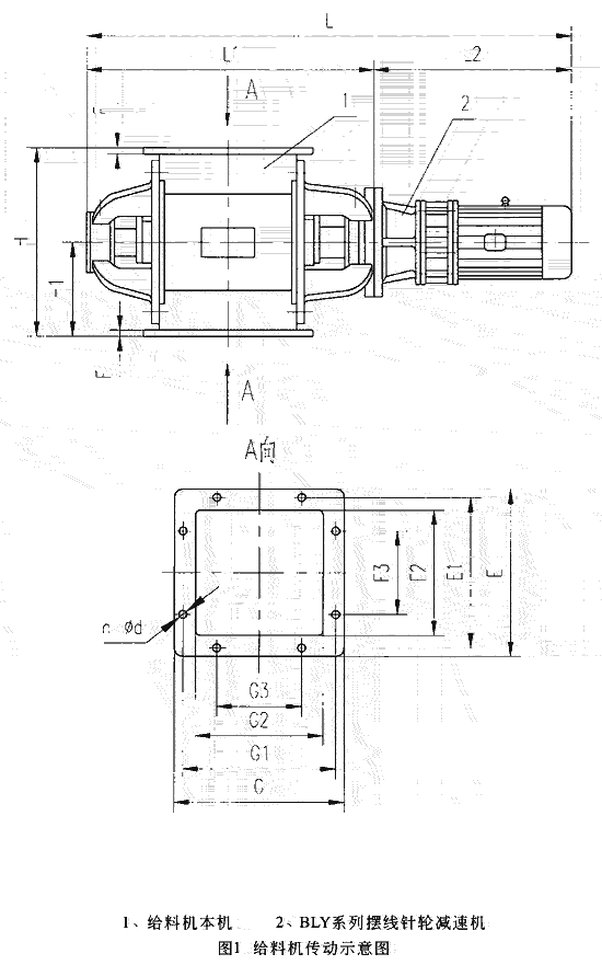 本機配用BLY系列擺線針輪減速機,其傳動方式、外型尺寸及安裝尺寸見圖1和表2。