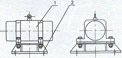 ZFB系列防閉裝置的結構如圖1所示。由振動電機(1),底座(2)兩部分組成。振動電機和底座由螺栓緊密地固定為一體。由于底座緊固地安裝在料倉壁上,這樣就構成了單質點定向強迫振動系統。當防閉塞裝置工作時,振動電機的高速轉動,便產生了對料倉壁的周期性高頻振動,由于防閉塞裝置的周期性振動,一方面使物料與倉壁脫離接觸、消除物料與倉壁的摩擦,另一方面使物料受交變速度和加速度的影響,處于不穩定狀態,從而有效地克服物料的內摩擦力和聚集力,以消除料倉內物料間的相對穩定性,使物料從料倉口順利排出。