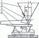 微型振動給料機(小振動給料機)的振幅和給料量受料倉倉壓影響較大,設計料倉時應盡量減少倉壓,使溜咀后側板承受一下的倉壓,并設置斜溜咀及下料閘門。如圖,一般a=1/4b。溜咀四周應與給料槽留有一定的間隙,一般5~10mm,以免產生噪音及影響振動。